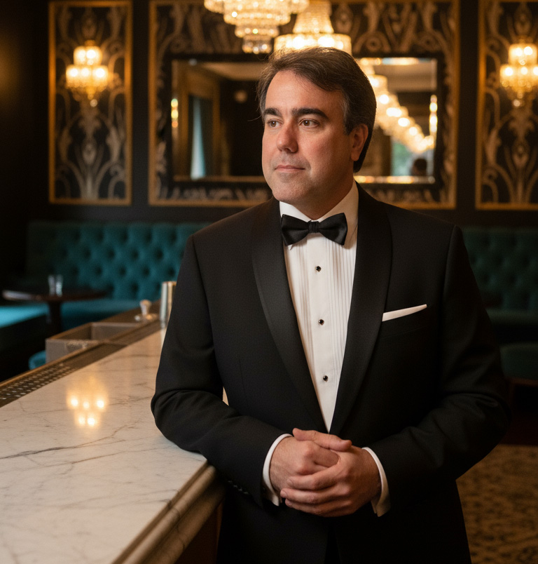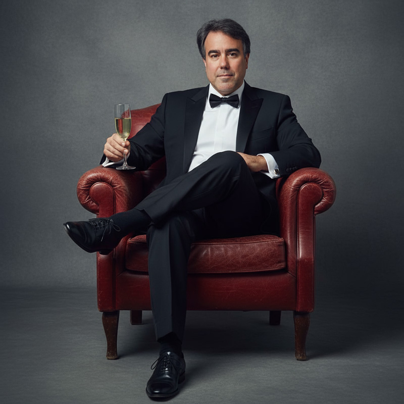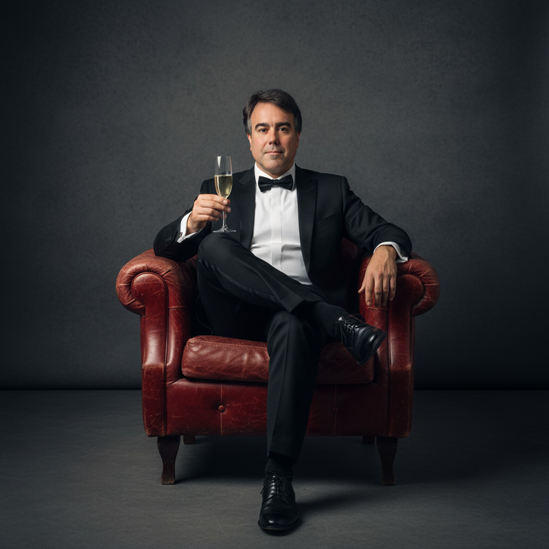 Este retrato transmite presença e autoconfiança, com estética cinematográfica e atmosfera de luxo discreto. A composição, a iluminação e os detalhes do traje criam uma cena atemporal — perfeita para quem deseja destacar sua imagem com classe e personalidade.