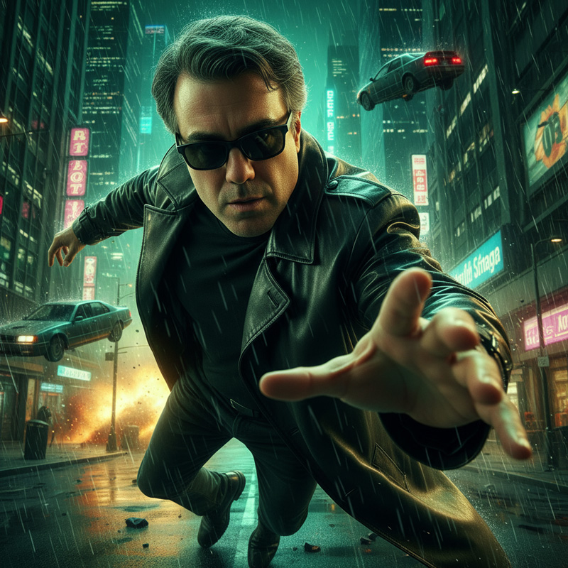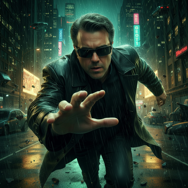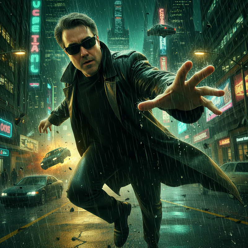 Com estética inspirada em The Matrix, o personagem surge em ação, de sobretudo preto e olhar determinado, desafiando a gravidade sob reflexos dourados e verdes de neon.