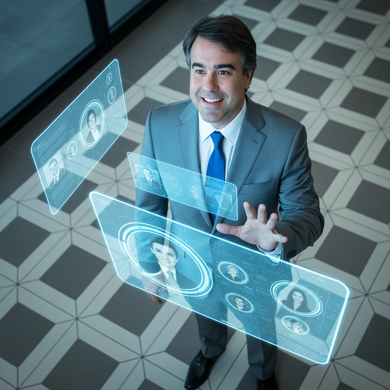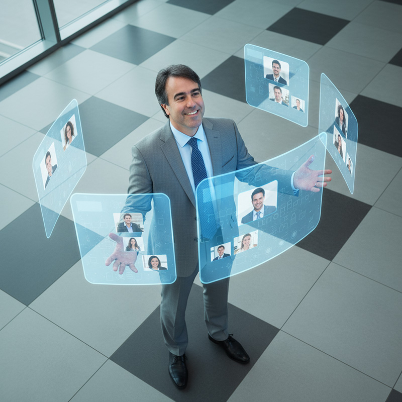 Hologramas flutuantes o cercam em uma dança de luz azulada, exibindo rostos, conexões e possibilidades — símbolo da comunicação global e do poder das redes humanas.