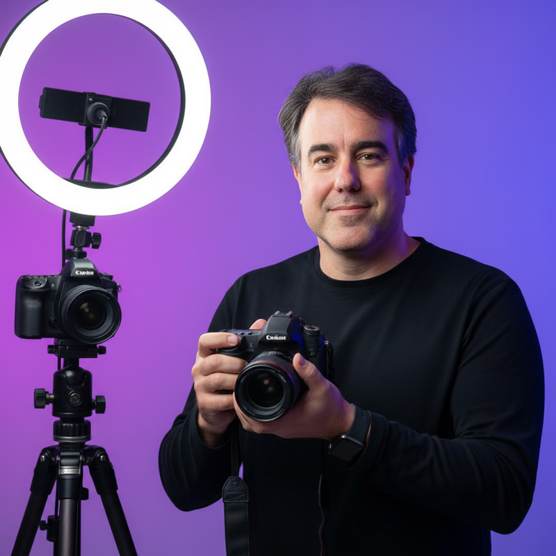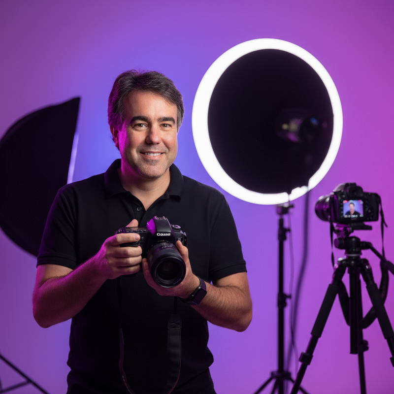 Entre tons de roxo e azul, o fotógrafo sorri diante das luzes, transformando técnica em emoção.