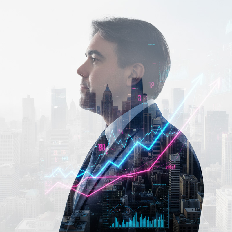 O perfil do executivo se funde a uma cidade futurista iluminada por gráficos e luzes digitais. Entre tons de azul e roxo, a cena reflete estratégia, inovação e visão de futuro, em um retrato cinematográfico e tecnológico.