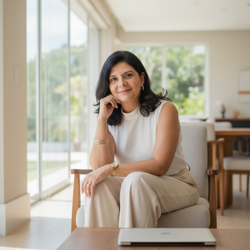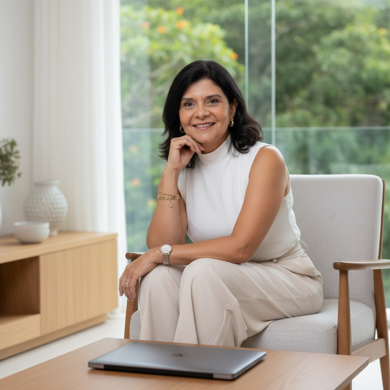 O visual é clean e contemporâneo, com tons neutros, luz natural suave e uma atmosfera acolhedora digna de um editorial de lifestyle premium.