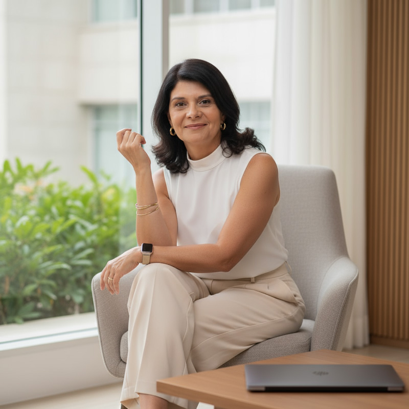 A cena captura uma mulher elegante em um ambiente moderno e iluminado, transmitindo equilíbrio entre leveza e profissionalismo.
