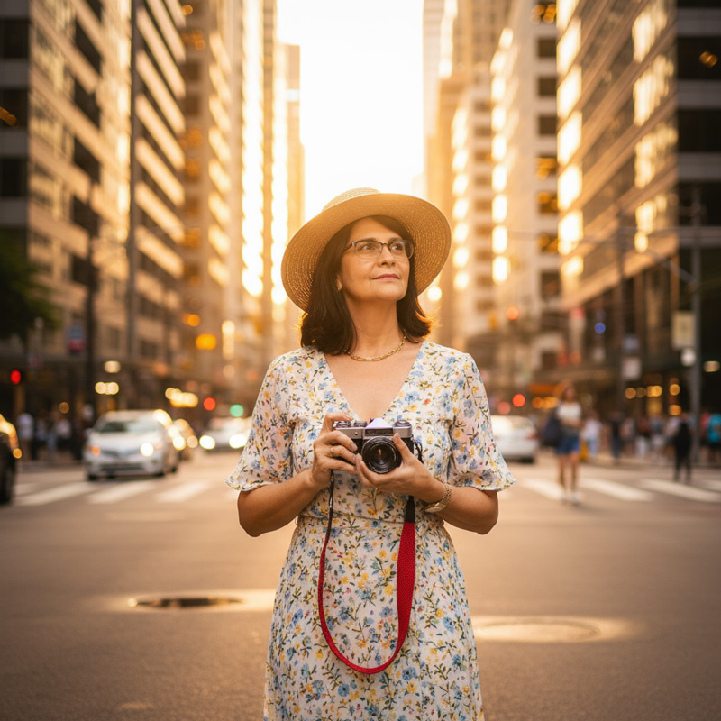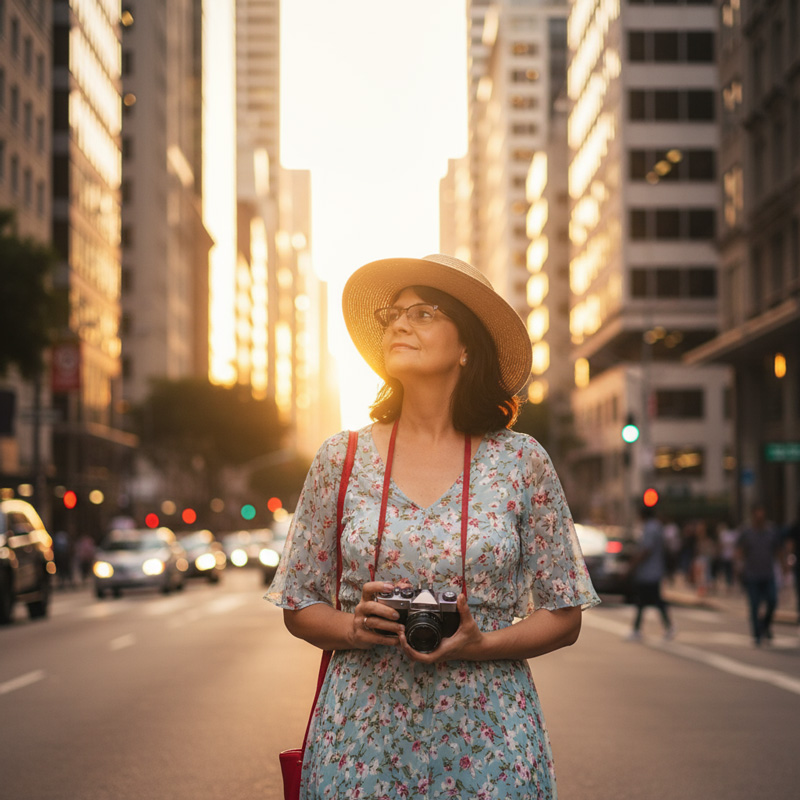 Banho de sol dourado e um olhar sonhador capturam a beleza da cidade e da descoberta.