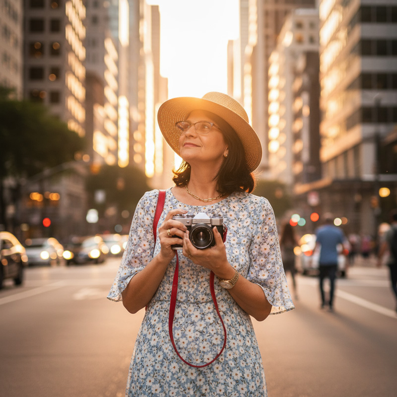 Com câmera vintage em mãos, a cena reflete nostalgia, leveza e alma cinematográfica, em um instante de pura inspiração urbana.