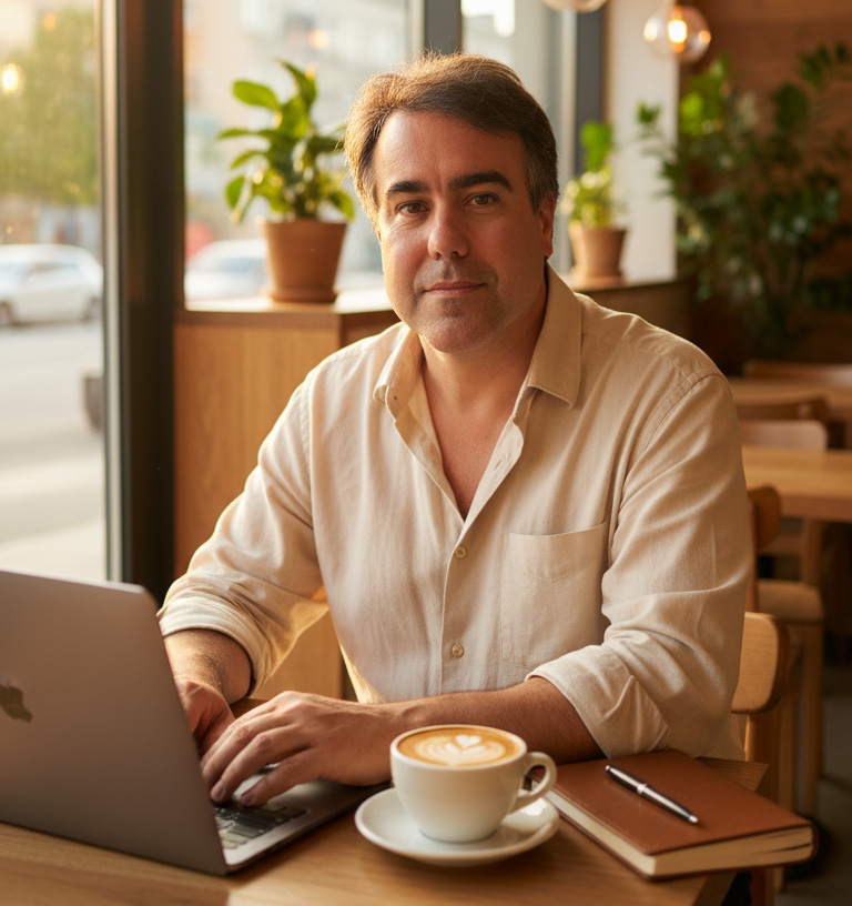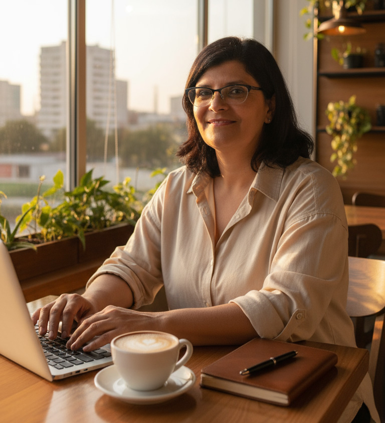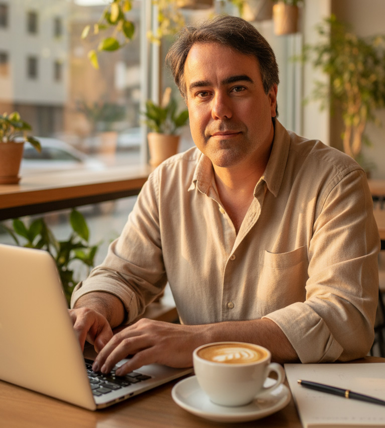 Este retrato combina sofisticação e aconchego, mostrando você em um ambiente moderno e iluminado, com postura natural e expressão confiante e acolhedora. Cada detalhe — desde a luz dourada entrando pela janela até o café com espuma artística sobre a mesa — é pensado para criar uma atmosfera autêntica e convidativa.