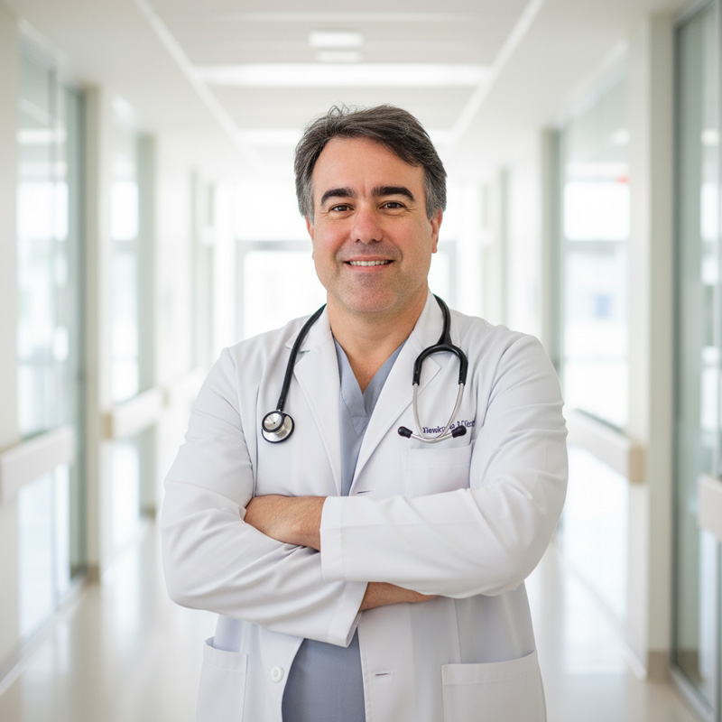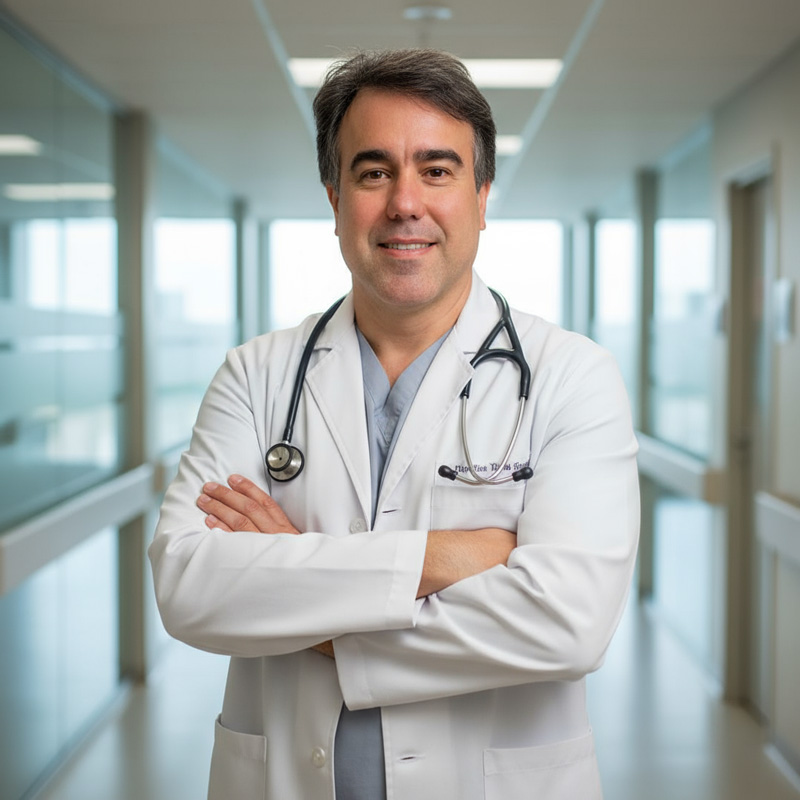 Em um corredor iluminado, o profissional da saúde transmite serenidade e presença, vestindo o jaleco branco com postura firme e olhar acolhedor.