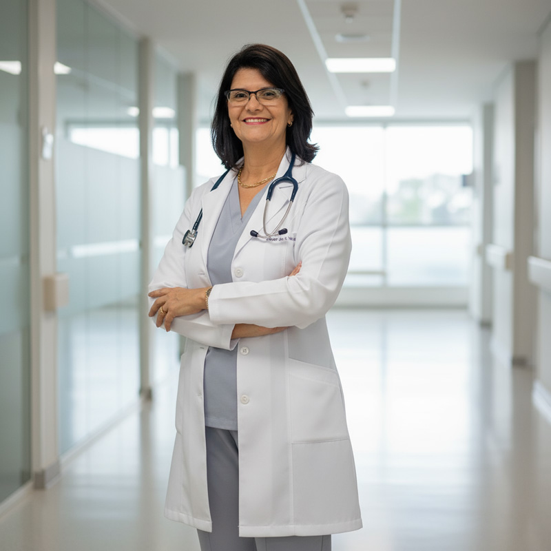 A luz suave e o ambiente clínico criam uma cena elegante e autêntica, símbolo de cuidado, precisão e empatia.